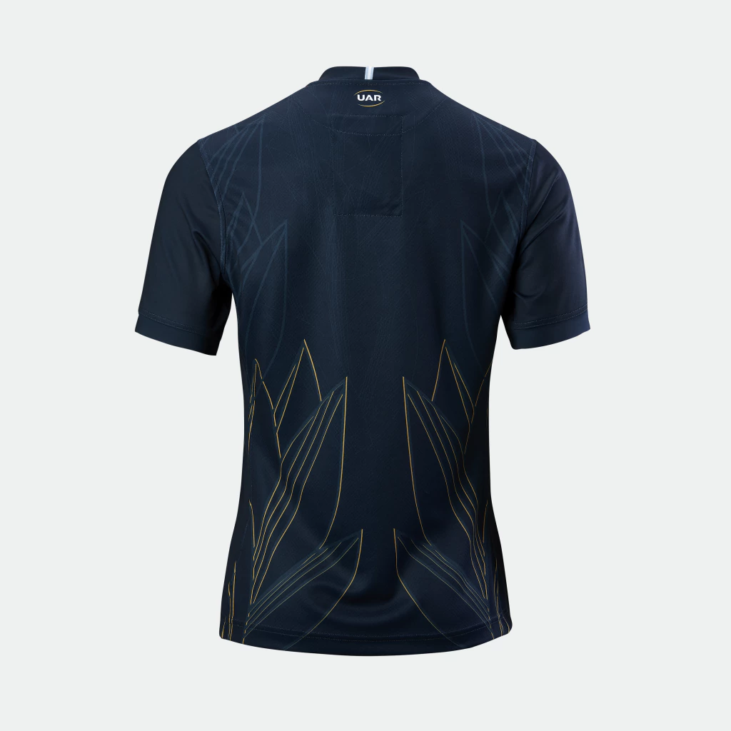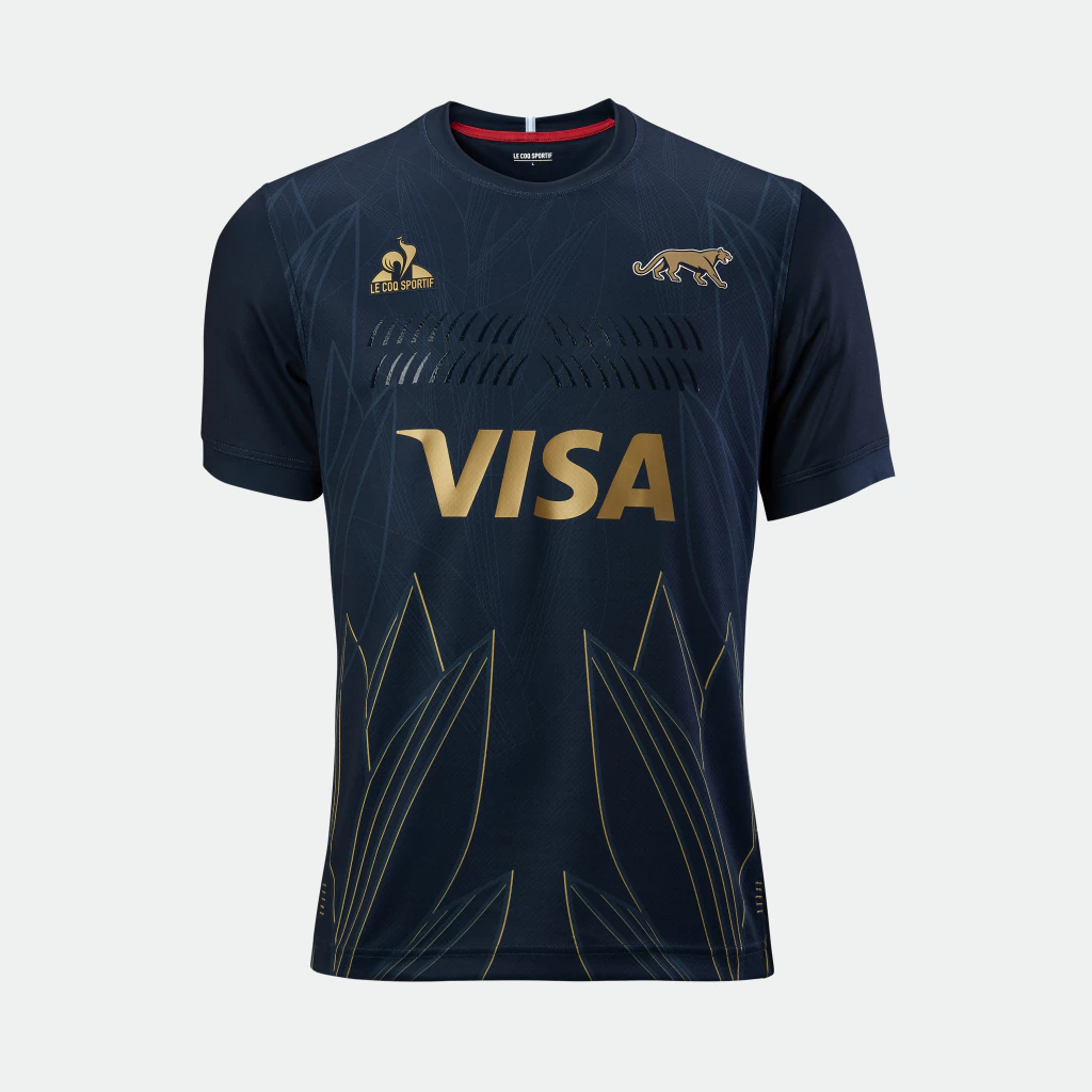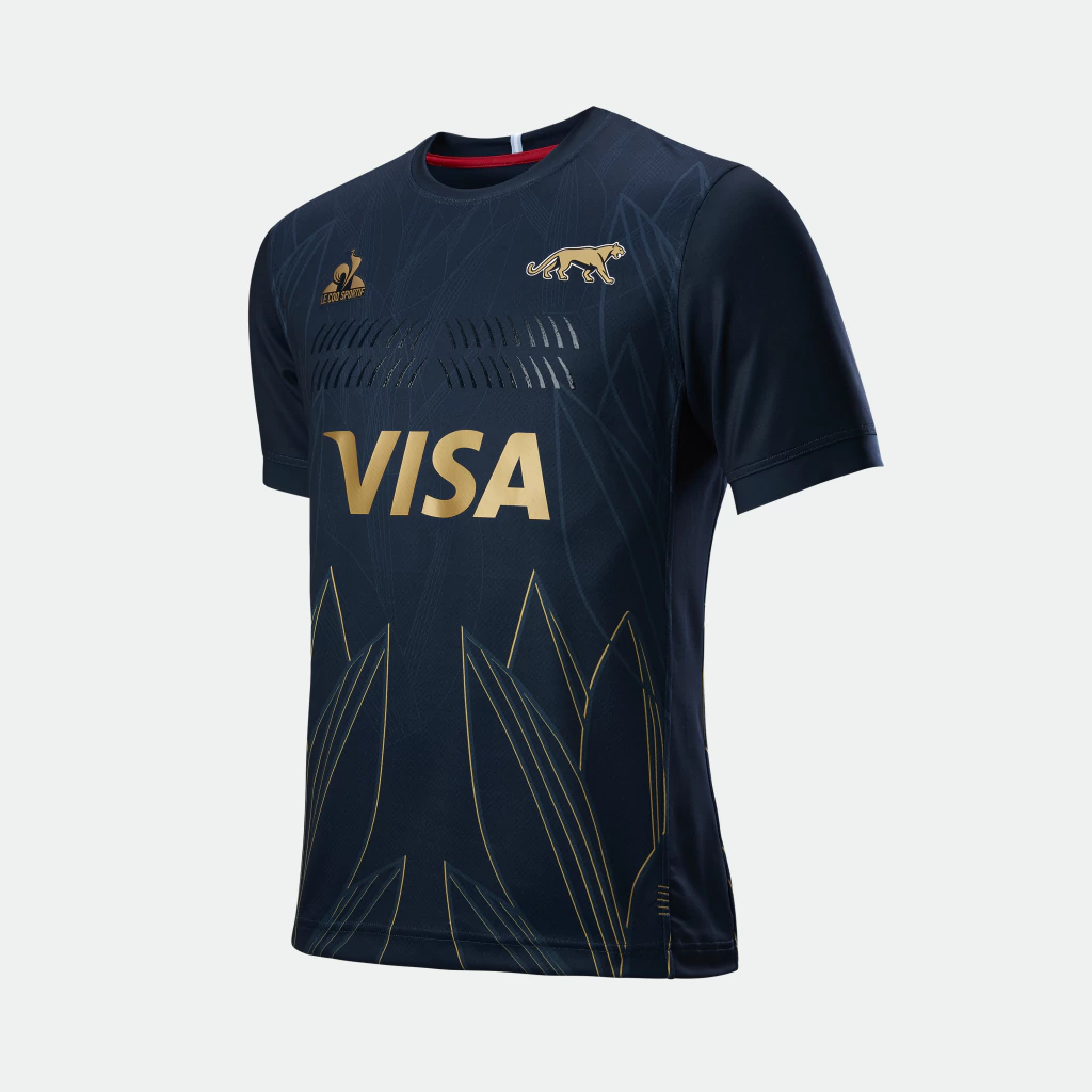 La camiseta titular de Los Pumas mantiene las características franjas horizontales celestes y blancas inspiradas en el color de nuestra bandera y un cuello redondo celeste.